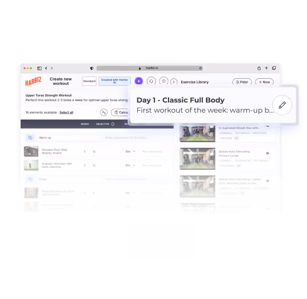 Greifen Sie auf eine professionelle Bibliothek mit Hunderten von Übungen zu oder laden Sie Ihre eigenen mit Video, Technik und Notizen hoch. Ihre Methodik, digitalisiert und skalierbar.