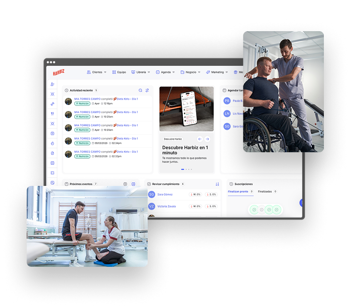 Como fisioterapeuta, gestionas sesiones, seguimiento, ejercicios y documentación clínica. Harbiz centraliza todo para que trabajes de forma más ordenada, profesional y eficiente.