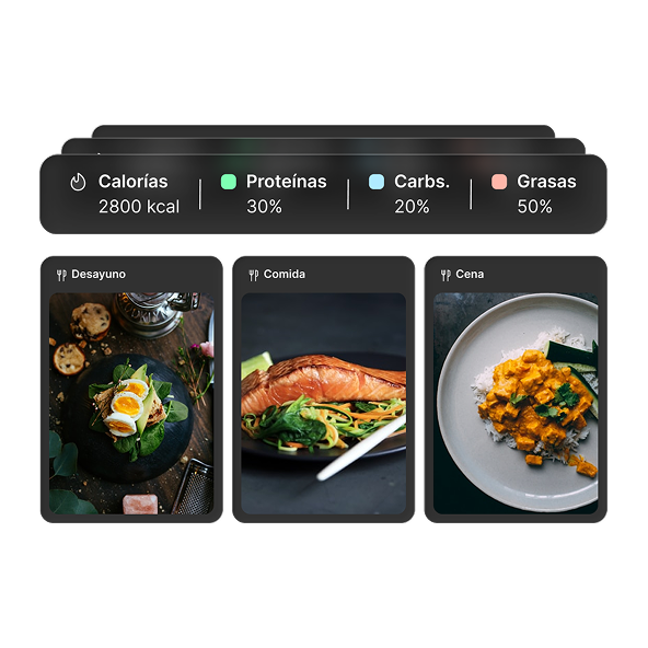 Crea planes nutricionales profesionales, adaptados a objetivos, gustos e intolerancias. Comparte todo en la app y haz seguimiento fácilmente.